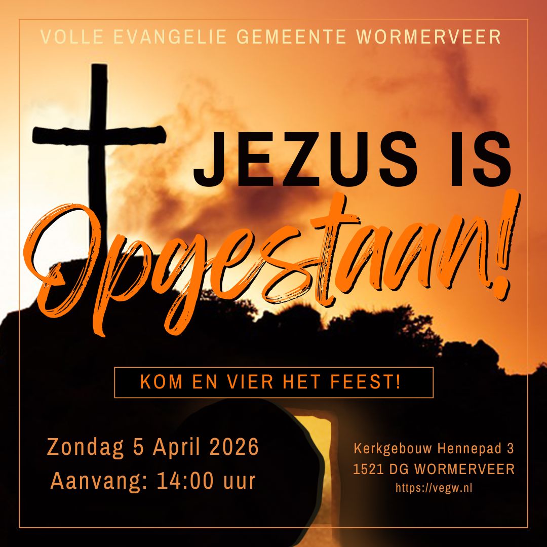 Op zondag 5 april vieren wij Pasen. Wij vieren dan dat Jezus waarlijk is opgestaan, Hij leeft! Kom je ook om samen met ons het Paasfeest te vieren? U bent van harte welkom. We starten zoals gewoonlijk om 14:00 uur.